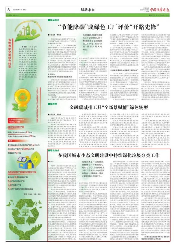 编者按全面绿色转型,是实现可持续发展的必由之路。工业领域,更新完善绿色工厂评价体系,助力实现“双碳”目标;金融领域,扩大碳减排工具支持范围,引导资金流向,助力绿色产业发展;生活领域,持续深化垃圾分类工作,促进资源循环利用、守护生态环境。本期“绿动未来”聚焦三大维度,旨在为读者提供一个观察视角,系统审视“多维推动全面绿色转型”系列政策,展现绿色发展的实践路径与政策逻辑。