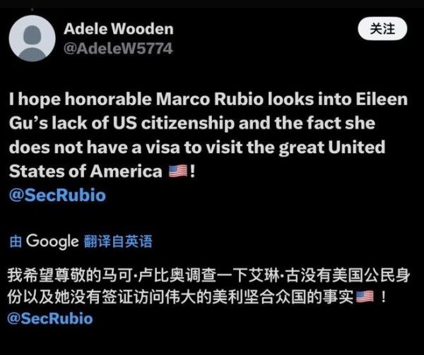 还有美国网友说道:“我希望尊敬的马尔科-鲁比奥调查一下谷爱凌没有美国公民身份,以及她没有签证访问伟大的美利坚合众国的事实!”