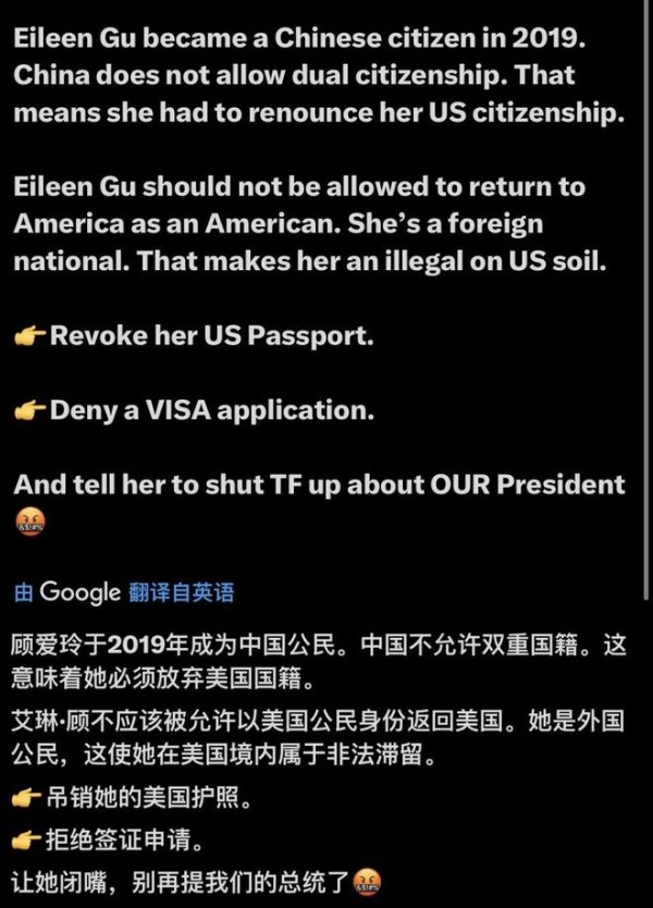 然而,美国网友依然在对谷爱凌进行网络暴力。有人说道:“谷爱凌于2019年成为中国公民。中国不允许双重国籍。这意味着她必须放弃美国国籍。谷爱凌不应该被允许以美国公民身份返回美国。她是外国公民,这使她在美国境内属于非法滞留。吊销她的美国护照。拒绝签证申请。让她闭嘴,别再提我们的总统了。”