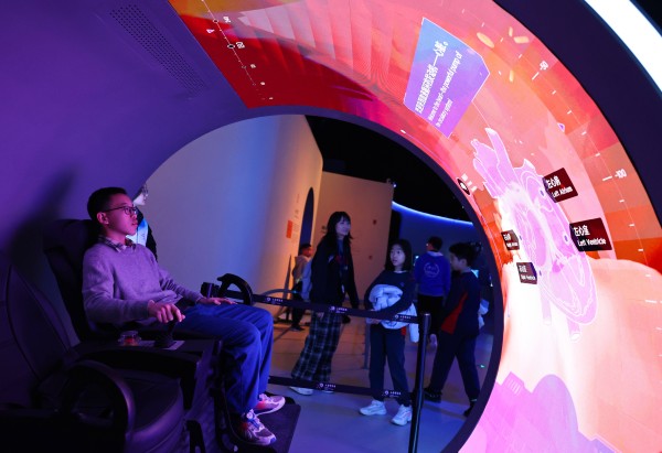 参观者在上海科技馆“神奇的我”展区内体验“血管漫游”体感游戏。新华社记者 方喆 摄