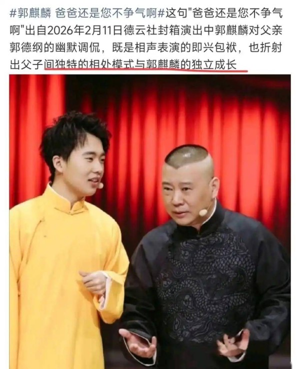 郭德纲与郭麒麟:相声界的父子情深,传承与独立的微妙平衡前言在当下的娱乐圈,家族传承一直是一个备受关注的话题,无论是影视圈的“星二代”,还是相声界的“相声二代”,他们的成长和发展都备受外界的关注。而在相声界,郭德纲和他的儿子郭麒麟无疑是最受瞩目的父子档之一,他们之间的互动和默契也一直成为大家热议的话题。