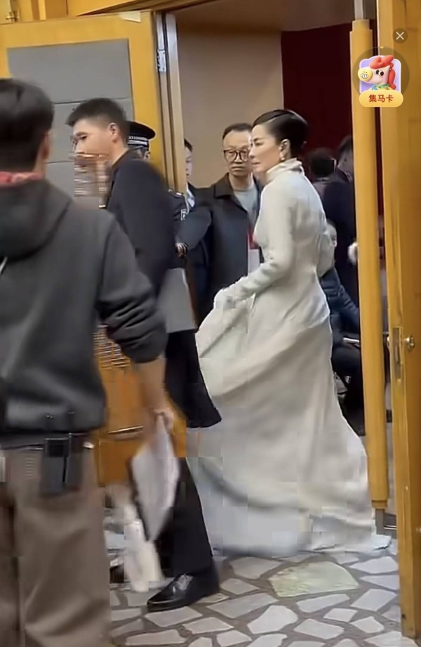 她穿白色修身呢大衣,内搭许是演出时的拖尾长裙,同样是白色系。拖尾款的设计,比去年的白裙更华丽繁杂了些。