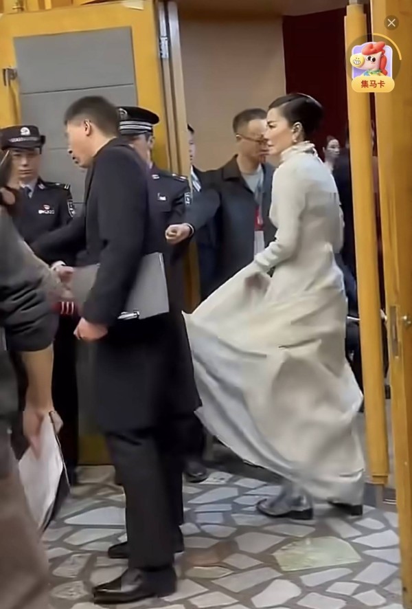 因为裙摆是拖尾设计,所以有助理跟在身后提裙摆。目测王菲的裙摆还是蛮长的,有点像走红毯的女明星。