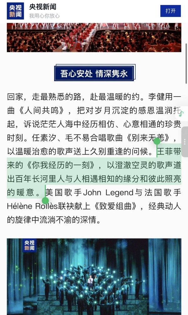 这一次王菲在2026马年春晚上带来的歌曲是《你我经历的一刻》,以澄澈空灵的歌声道出百年场合里人与人相遇相识的缘分和彼此照亮的暖意。