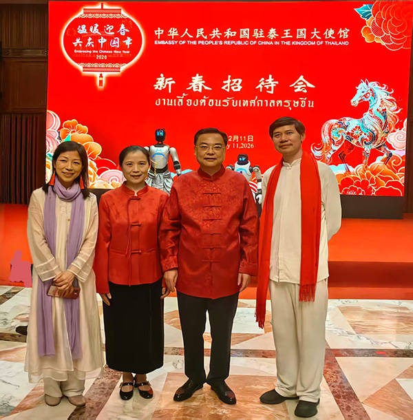 中国驻泰国特命全权大使张建卫(左3)携夫人苗海燕(左2)与谢飞东(左4)、聂晖(左1)合影留念,感谢他们为中泰文化交流作出的努力