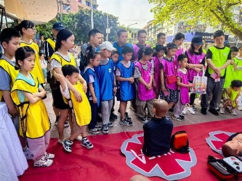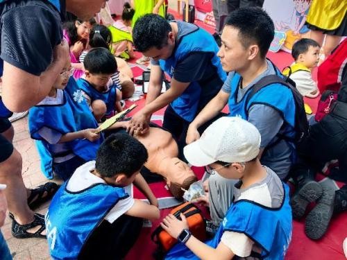 在颁奖仪式结束后,现场进入急救知识与技能宣传环节。现场共设置了成人心肺复苏、头部外伤包扎、解除气道梗阻、自制止血带4个宣传点位,社工与志愿者们共同向广大社区人员进行应急救护与安全知识的普及宣传。