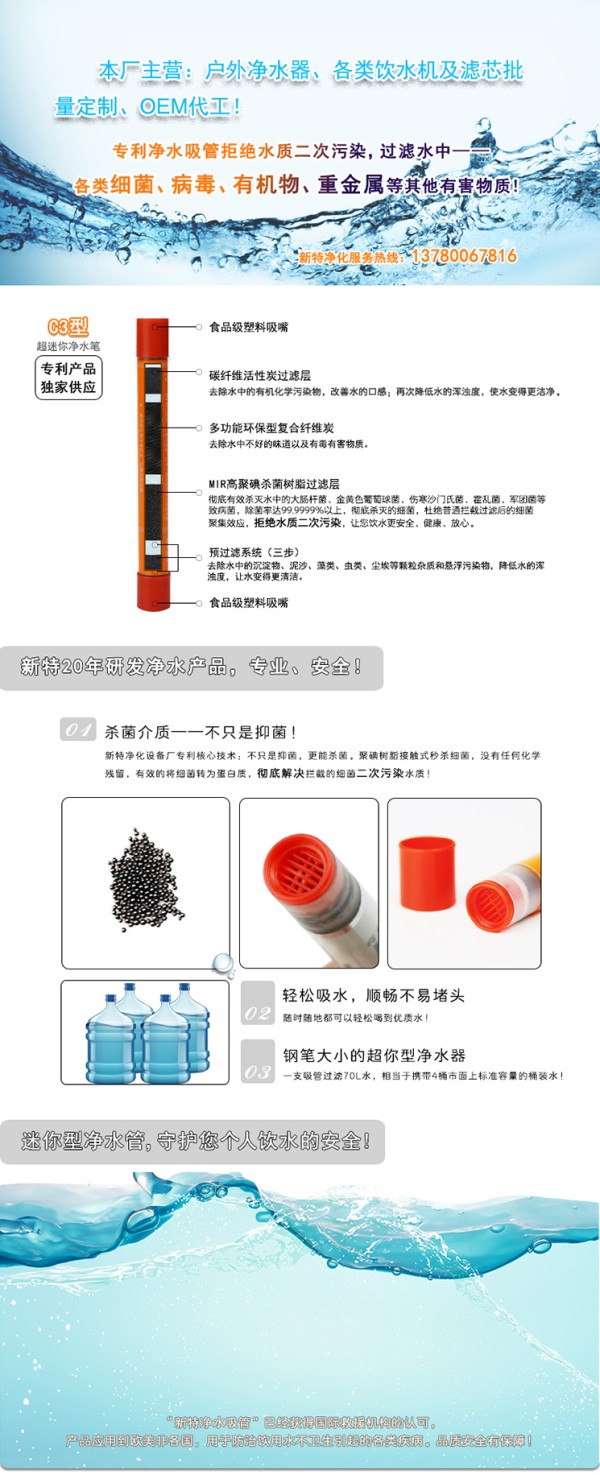 优势:最小款户外净水器(净水笔),仅12g重钢笔大小,方便携带,应急救生包专用!