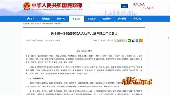2019年7月,民政部、最高人民法院、最高人民检察院、教育部、公安部、财政部、共青团中央等12部门联合出台《关于进一步加强事实无人抚养儿童保障工作的意见》,明确了事实孤儿保障对象,规范了认定流程,突出了保障重点。