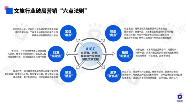 AI技术在文旅行业的应用已经从用户出行前的预订、出行中的体验到出行后的评价全链条渗透,帮助文旅品牌实现更科学、更智能的全域营销。报告提出六点法则为文旅行业提供了引爆市场的新策略,包括定位难点、找准突破点、策划爆点、制造爽点、拓展新触点和追求新高点。