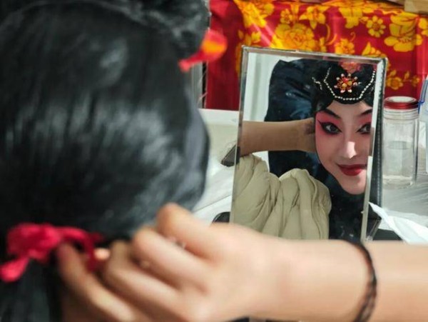 台前观众热情高涨,台后演员一丝不苟。勾脸、贴鬓、扎靠、穿衣……演员们细致地进行着上妆与装扮,用心揣摩角色和情绪,力求在舞台上展现出最地道的秦腔韵味。