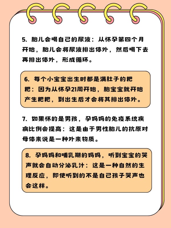 5. 胎儿会喝自己的尿液:从怀孕第四个月开始,胎儿会将尿液排出体外,然后喝下去再排出体外,形成循环。