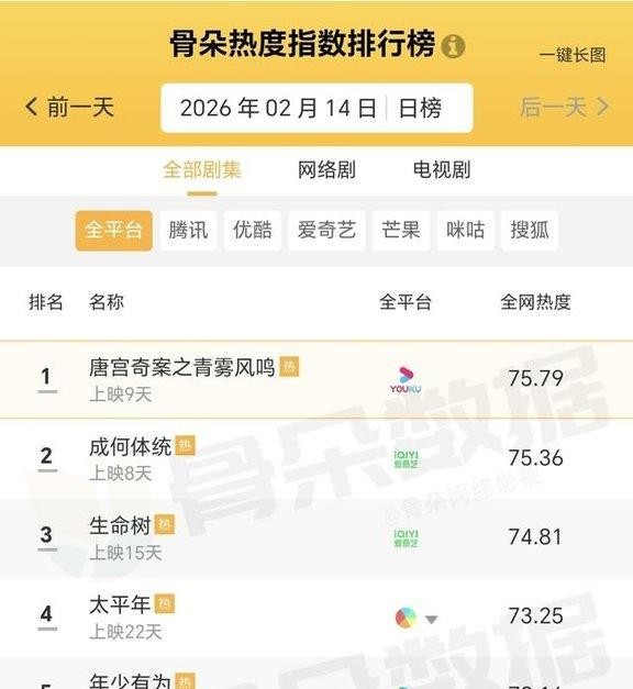 电视剧全网热度榜,生命树降至第三,第一热度高达7579