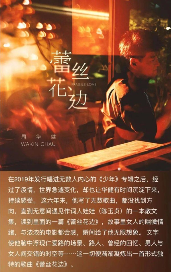 所以,当今天无意中看到他的新歌《蕾丝花边》时,我真的是吓了一跳。这个歌名乍一听有些让人望而却步,可我实在是太久没听到老周的新作品,自然忍不住点进去听听这首《蕾丝花边》到底讲的是什么。