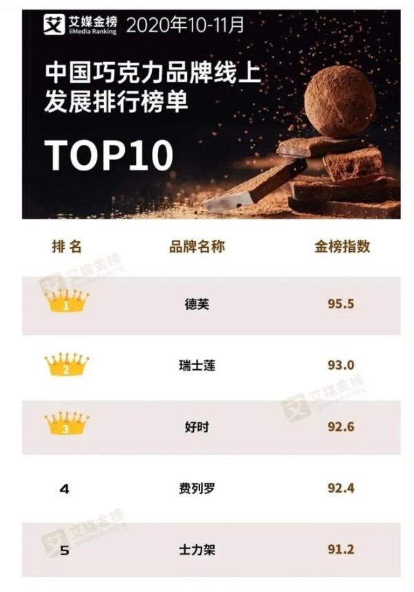当然,德芙的丝滑女神并不只有这四位,在近几年的发展中,德芙始终将目光聚焦于当红女星上,从下凡人间品尝德芙的月亮女神赵丽颖到元气少女杨超越,再到新年得福的马思纯,在众多明星女神的代言下,德芙始终保持着高水平的市场好感度。艾媒金榜前段时间发布的中国巧克力品牌线上发展排行榜单显示,德芙品牌以95.5分高居榜首,遥遥领先。那么,为什么德芙走进中国市场30余年后的今天,这样一个老品牌还能在市场用户中保持高好感度呢?