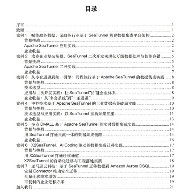 这本长达 21 页的案例精选集汇总了 2025 年 Apache SeaTunnel 在知名企业的典型实践,像同程旅行、中控技术、多点 DMALL ,还有天翼云、亚马逊云科技,以及某政务企业和某安全龙头企业等等。内容超丰富,从数据集成、迁移工具,到批流一体、二次开发,再到实时同步、资源隔离和运维优化,全流程应用场景都覆盖到啦,完美展示了企业在大规模数据处理和平台建设过程中的落地经验和技术探索。