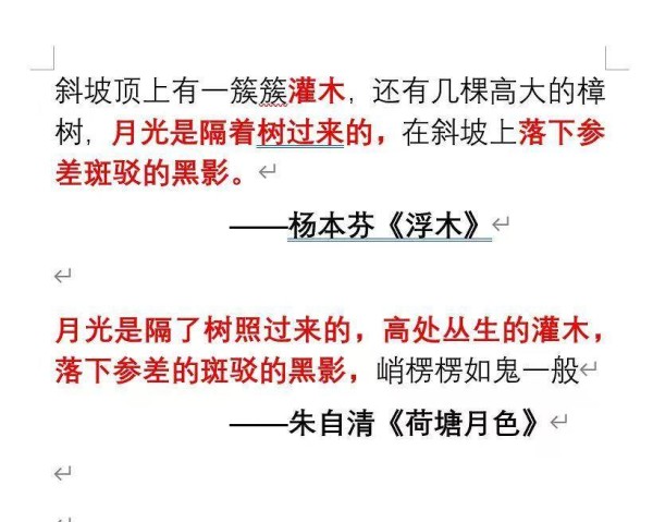 在“抒情的森林”晒出的对比图中,杨本芬出版于2021年的《浮木》中的句子,与朱自清作品《荷塘月色》中的句子出现相似之处。