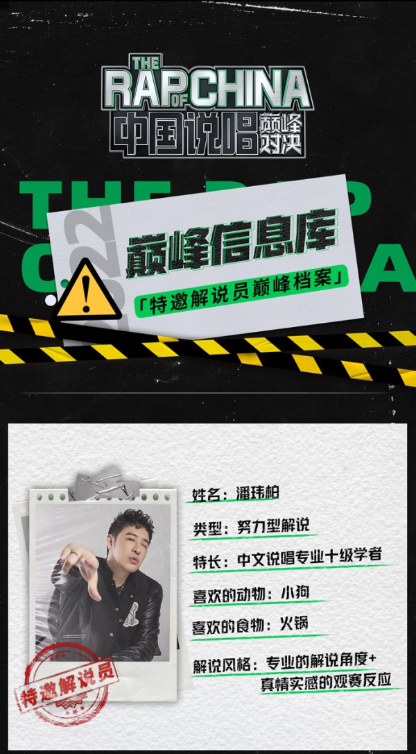 关注看点:2022年6月20日,《中国说唱巅峰对决》公布了两个“特邀解说员”,一个是潘玮柏,一个是池子。潘玮柏连续6年成为这个节目的导师,不愧是华语乐坛“第一说唱高手”。