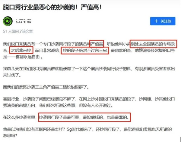 此前有网友爆料:“我们脱口秀演员有一个专门抄袭同行段子的演员叫严值高,听说他叫小弟到处去全国演员的专场录音,之后拿来抄,而且非常诚信,抄的段子绝对不过东三省,最幽默的是,他跟演员经常提的口号是——喜剧永远自由 。”
