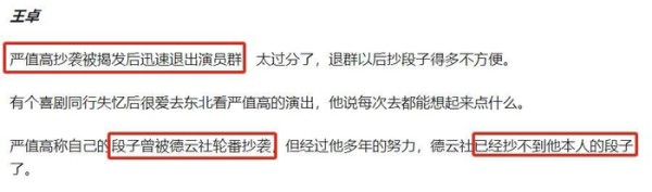据这名网友爆料,严会特地坐飞机去其他脱口秀演员的专场里抄段子,有时候来回机票都几千块,就只为抄到一句好段子,回到东北当做爆场王。“严值高抄袭被揭发后迅速退出演员群,有个喜剧同行失忆后很爱去东北看严值高的演出,他说每次去都能想起来点什么。严值高称自己的段子曾被德云社轮番抄袭,但经过他多年的努力,德云社已经抄不到他本人的段子了。”