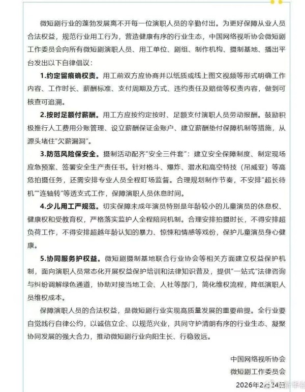 近日,中国网络视听协会微短剧工作委员会发布《关于保障微短剧行业演职人员合法权益的自律公约》,倡议所有微短剧演职人员、用工单位、剧组、制作机构、摄制基地、播出平台约定留痕权责,按时足额付薪酬,防范风险保安全,少儿用工严规范,协同服务护权益。