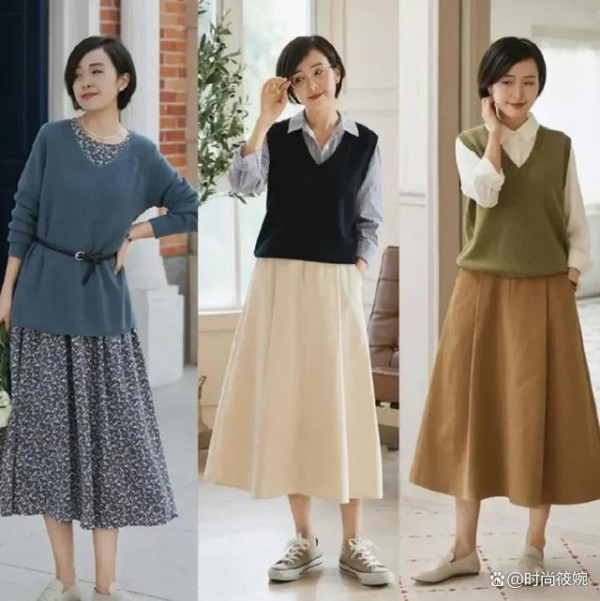 如果感觉搭配九分裤不够女人味,针织衫配膝下裙一定能满足你的需求,优雅、高级又显甜美气质。像博主一样,可以用针织马甲叠搭衬衫配长裙,或者针织衫叠搭连衣裙,都是很不错的组合方式,时髦又让穿衣很有层次感。