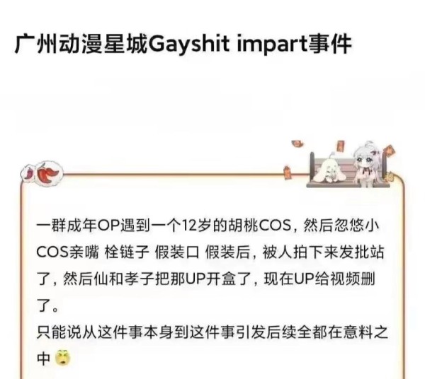 无论是发上网的UP主,还是怂恿小女孩的另一位COS,又或者是参与猥亵女孩的人员,这些人做的事情都太恶心了,也让原神和COS圈出圈了,二次元文化又躺雷?