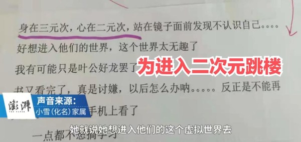 在女孩的日记中曾写到,“身在三次元,心在二次元,站在镜子面前发现不认识自己。好想进入他们的世界,这个世界太无趣了。”