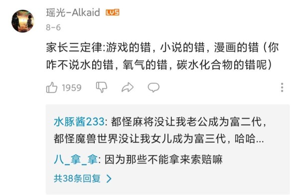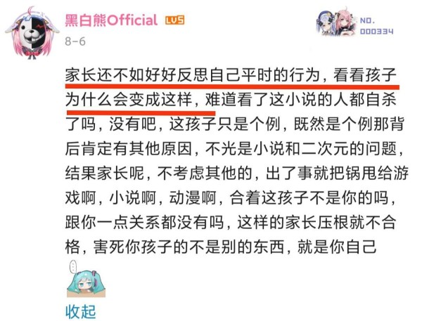 现在的很多家长,平时因为工作忙可能疏于对孩子的管理,但出了事就喜欢把锅甩给游戏,小说,动漫这些。我们应该更多地去反思反思自己,为什么孩子会沉迷,是二次元真的看一眼就让人无法清醒,还是平日里少了对孩子的关心和教育。