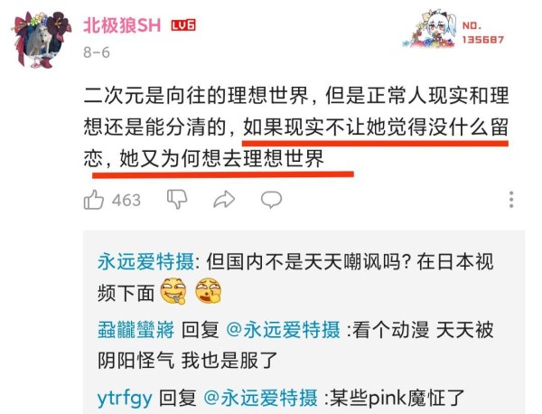 也有网友表示二次元是向往的理想世界,但是正常人现实和理想还是分得清的,如果现实没有让她觉得毫无留恋,那她又怎么会想去理想世界?