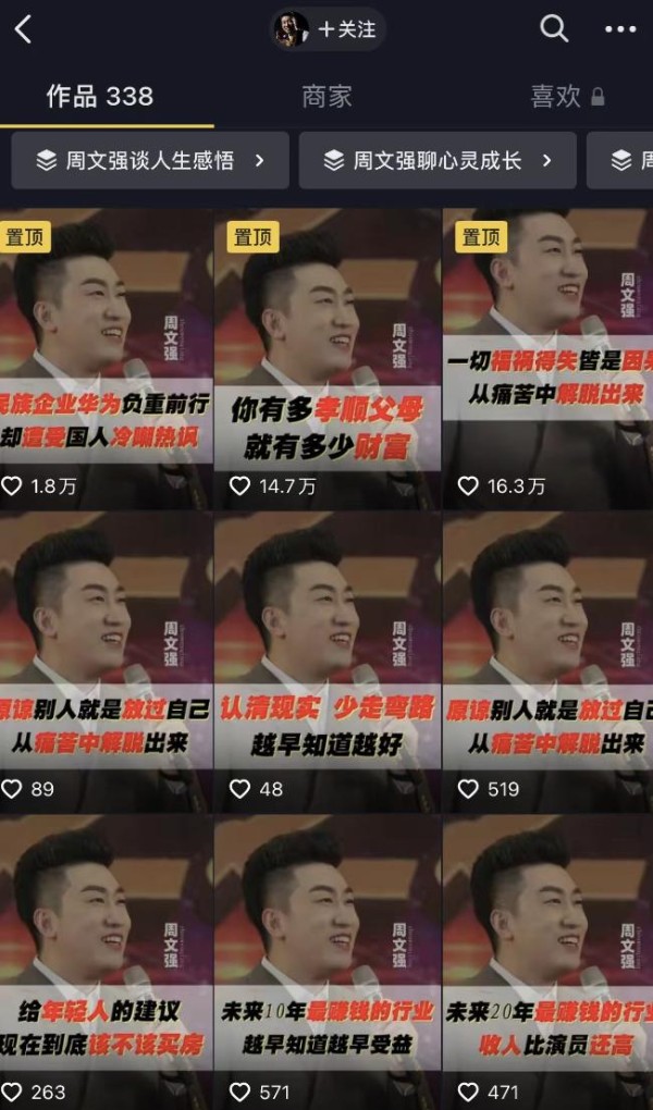 在抖音上,数十个与周文强相关的蓝V账号,每天不间断重复发布着这位“大师”激情澎湃的演讲片段,在一段段“至理名言”的熏陶下,越来越多用户被大师的魅力所折服,最终加入到买书、报课的大军之中。