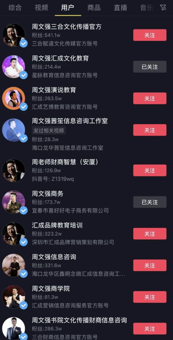 例如最大的账号”周文强三合文化传播官方“拥有超过540万的粉丝,周文强汇成文化教育、周文强商务、周文强演说教育、周文强信息咨询、周老师教育信息等账号粉丝数均在百万之上。