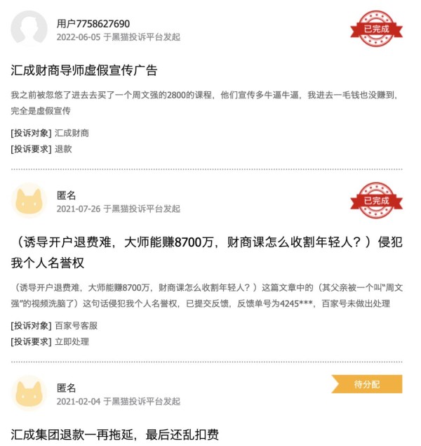 然而在黑猫平投诉台上,不止一位消费者对相关课程进行了投诉,投诉理由包括“虚假宣传、退款困难、收割年轻人”等。一位交了钱的学员称:“我之前被忽悠了进去去买了一个周文强的2800的课程,他们宣传多牛逼牛逼,我进去一毛钱也没赚到,完全是虚假宣传。”