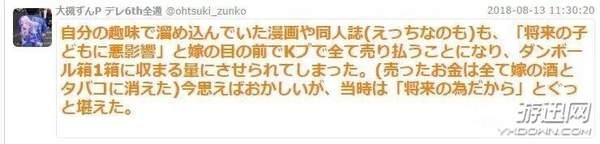 这位推特名为“大槻ずんP デレ6th全通(@ohtsuki_zunko)”的宅男非常喜欢动漫和游戏相关的内容,每天都在刷《偶像大师》《赛马娘》《樱桃小丸子》《pop子和pipi美的日常》等热点话题,参加各类宅活动,和普通的宅宅并无区别。不过这一切在他结婚之后发生了翻天覆地的变化,他的妻子以“已婚者要成熟”为由不准他参加偶像的演唱会,以“不利于将来的孩子成长”为由卖掉了他多年珍藏的漫画和小本子。然而最让他气愤的是,妻子口口声声为将来孩子着想做了这一切,转头却把这笔钱用于自己的吸烟喝酒。最终这位网友选择离婚,并告诫他人千万不要跟不能理解自己爱好的人在一起。