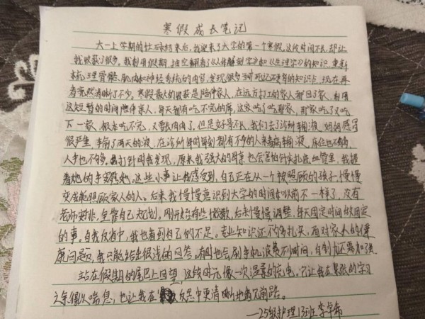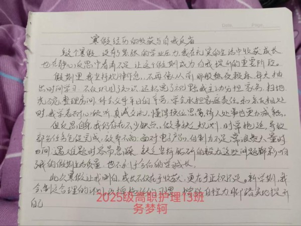 在活动期间,同学们围绕“寒假日常记录”与“成长感悟撰写”两大核心环节展开实践。在日常记录中,大家用镜头定格居家学习、志愿服务、亲情陪伴等充实瞬间,在点滴行动中践行护理初心,将专业知识融入到社区健康宣教,为群众筑起一道坚实的安全防线;在成长笔记撰写环节,同学们结合寒假经历,系统梳理专业学习收获、思想认知变化与自我反思,让思想在碰撞中实现认知拓展与觉悟提升。