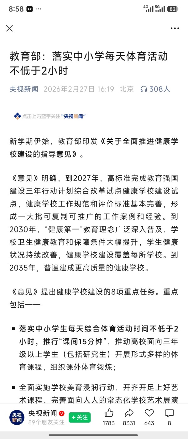 此次会议明确了多维度的工作重点。基础教育阶段,重点在于高质量落实中小学生每天2小时体育活动时间。通过“晒课表”等方式加强监督,严厉查处挤占体育课、课间禁止学生出教室等行为。