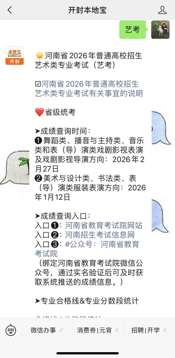 温馨提示:微信搜索公众号【开封本地宝】,关注后在对话框回复【艺考】可获河南省2026年艺考各专业成绩查询时间/入口、专业合格线、专业分数段统计表及高考更多相关信息等。