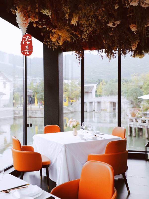 拾璞,静静伫立于江南诗意建筑群中,其外观承袭了江南水镇古典韵味,步入餐厅,鲜花与餐厅空间完美融合,设计兼具江南雅韵又不失时尚简约,营造出一种既古朴又清新的用餐氛围。餐厅犹如镶嵌于江南水镇中的瑰宝,临水而居,尽揽江南水镇韵味。在这里用餐仿佛置身于一片绚烂的花海之中,让人心旷神怡。包间内的悬挂设计灵感源自自然界的波浪,轻盈飘逸,与窗外波光粼粼的湖面遥相呼应。色彩的运用上,大胆而不失和谐,大面积的橙色温暖而明媚,为空间注入了一股活力与热情;跳跃的紫色则增添了几分神秘与浪漫。
