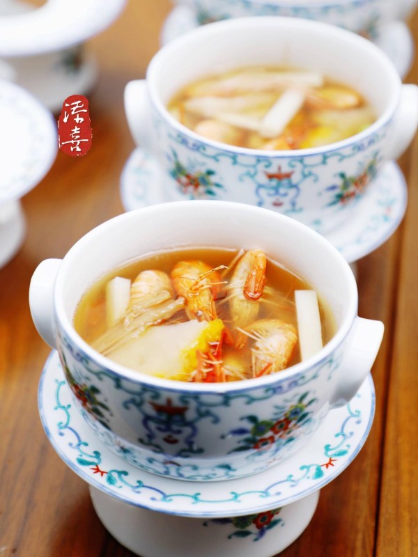 【湖-菜脯头煮河虾】此菜之妙,在于那份始终如一的鲜美汤底主料——菜脯头,其独特的香气与味道,如同味觉的印记,深刻而鲜明,让人一尝难忘。主厨巧妙地利用这份老味道,与季节变换的新鲜河虾,粤菜海鲜黑金鲍或象拔蚌等相结合,传统老菜在新鲜食材的注入下焕发新生。