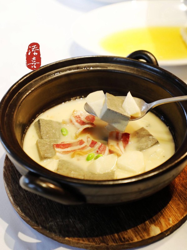 【海-浓汤海皇烩自制有机黑豆腐】恒久不变的秘制黑豆腐,以黑芝麻与核桃为基底,外表看似简朴的老豆腐,实则内里嫩滑如丝,带来意想不到的口感反差,随着季节的更迭,精选当季海鲜珍品如扇贝的鲜甜、大虾的弹牙或墨鱼的脆嫩。