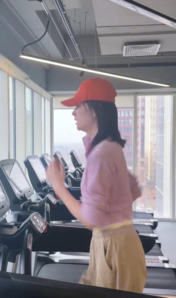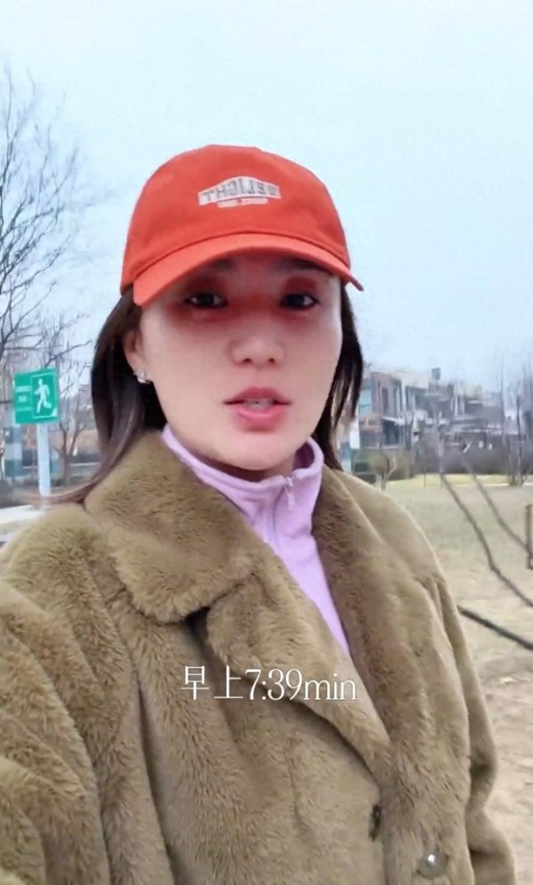 在早晨7点39分,北京的天气略显寒冷。她已经穿上了棕色的毛绒外套,并穿上了粉色的高领衫。她还戴了一顶红色的棒球帽。面对镜头,她高兴地挥了挥手,并提议去跑步。