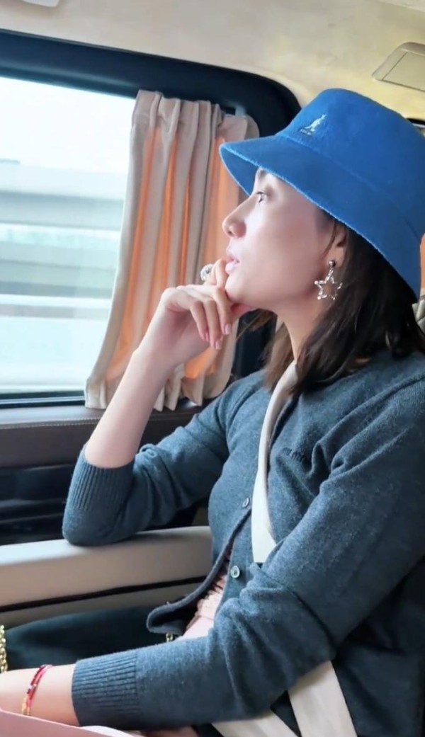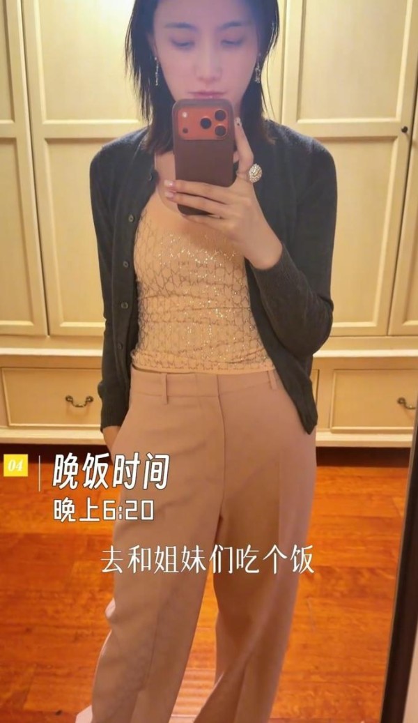 到了晚上6点20分,她换上了新的服装,并在镜子前为自己拍照。她看上去非常开心,因为她即将与好友们共进晚餐。当她坐在车内时,她还戴上了一顶蓝色的渔夫帽,这使得她看起来更加轻松自在。