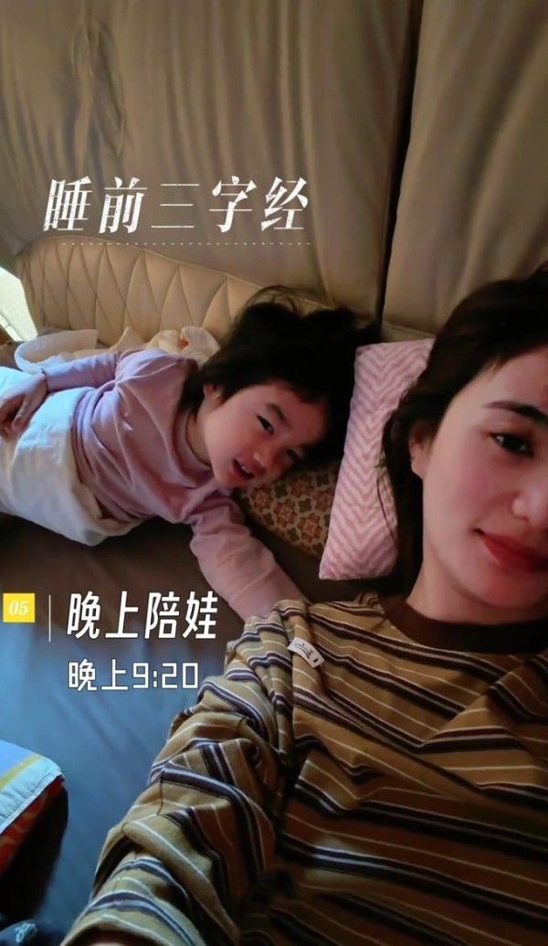 但是一天里最温暖的时候,是在晚上9点20分,她穿着条纹睡衣,脸上没有化妆,和女儿一起躺在床上,女儿奶声奶气的读着三字经,然后贴心的和网友说,我要睡觉了,我要给妈妈讲故事了,你们也快睡吧,早睡早起身体才会好。听到孩子这么懂事的话,当妈妈的心里肯定比喝了蜜还甜。