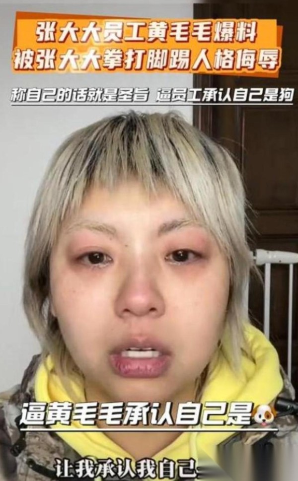 如果说这些还算“软暴力”,张大大的操作已经突破底线,今年初,他前员工黄毛毛实名爆料,仅仅因为改了脚本几句,就被叫进酒店房间痛打一顿,从枕头砸到玻璃茶几再到飞踹,全程保镖劝架还被呵斥:“我要打人!”最后逼90度鞠躬、反复道歉、自辱人格,那句“我的话就是圣旨”简直令人脊背发凉,更夸张的是事件并未止于酒店,多名陌生人在深夜砸她家门,公司内部还诱骗签署离职协议、抢手机、限制自由,一条龙搞到明面上来了。