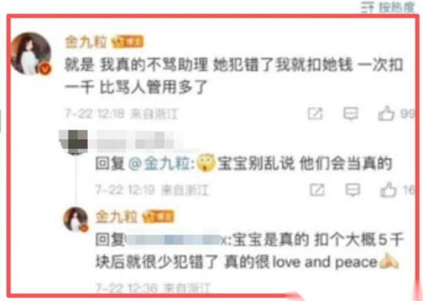 再看蔡徐坤,他下飞机双手插兜,一切东西让助理拎着帽子吹落也只是打个响指示意去捡,上电梯宁可等门关,也不自己抬手拦一下,有粉丝护航“造型需要”,可保持造型和尊重别人从来不冲突,一个连抬手都嫌累的人,你指望他有偶像担当?更离谱的是金靖,她面对打骂助理的传闻,不但没否认,还自爆罚钱流程,“犯错就扣一千,扣到五千后就学乖了”,嘴上说love and peace,其实透心凉,对普通打工人来说,一个月工资才四五千,一次失误就砍掉四分之一甚至更多,被克扣的钱虽后来退回,但期间压力谁来管?