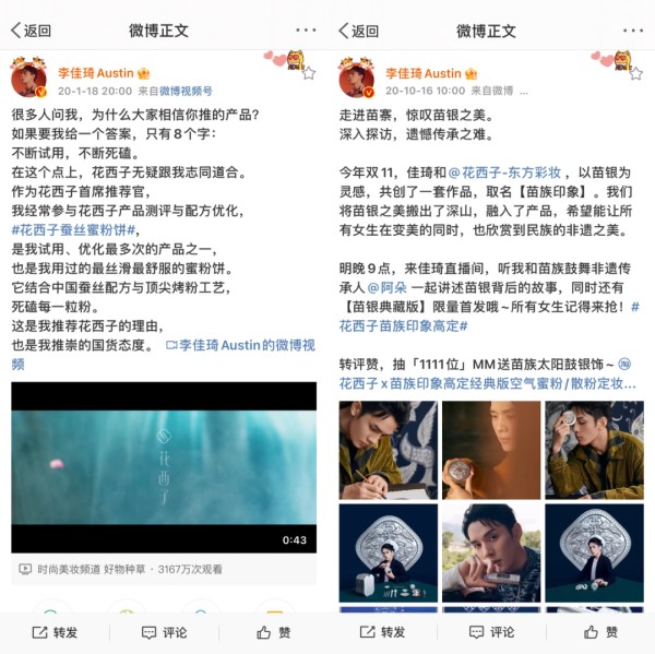 与此同时,李佳琦也在十分尽责地做了“推荐”的任务——在微博和自己的直播间里,李佳琦多次特意强调自己对花西子选品与产品把控的专业度。随后,两者还一同登上了《非一般非遗》纪录片和芭莎杂志全新雕花口红宣传大片,进一步提升了花西子的品牌影响力。