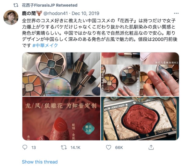 2019年以来,主打烈焰红唇、陶瓷肌的“中国妆”开始在日本走红,甚至曾带动“中华系美人”(Chiborg)成为日本流行词。一时间YouTube的不少日本美妆博主都分享了中国妆教程,月活跃用户达1300万的口碑网站cosme也开始推出中国彩妆特辑。2020年1月,日本知名女星石原里美用中国妆拍摄了《VoCE》;10月涩谷专业美妆秀上,主办方也直言中国妆热潮必将来临。