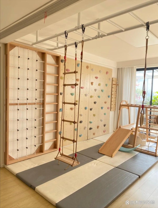 就比如说这个秋千,给了一家人带来无尽的欢乐,还有顶面的云梯、墙壁的攀岩墙,这些原本在户外的设施都设计进家里,能消耗精力旺盛孩子,自己也更加省心了。如今做完功课,孩子们不再是拿起手机和平板,而是喜欢聚在这里玩。