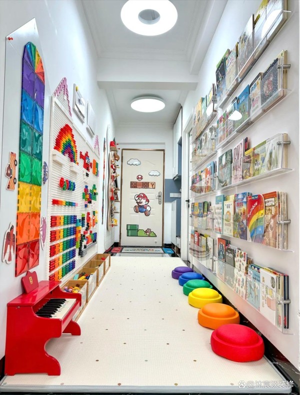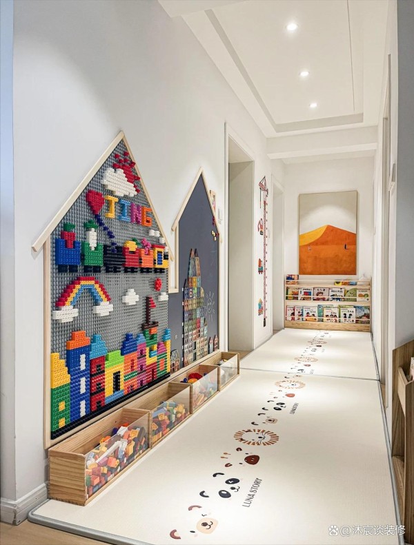 原本没什么用的走廊,在一些人的巧思下,也被打造成儿童的专属游乐区。就像璟璟家,更是因为走廊的“适童化”设计在小区里出名了,邻居们争相模仿,她把走廊打造成一个积木墙,让走廊一下子就利用上了,实用性也更高,孩子可以在这里玩上一个下午不成问题,自己省心且轻松多了。