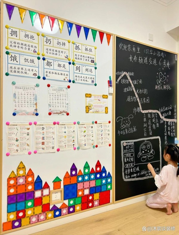 即便是装修好了的房子,可以装树脂珐琅板材质的,直接就能壁挂安装,根据墙面大小来定制,装上去就像小时候学校用的黑板是一样的,甚至比以前的黑板多了磁吸功能,可以吸附像乘法口诀表之类的。也有些人在边上加做一块用软木做的照片墙,可以贴上照片和画作,总之很完美!