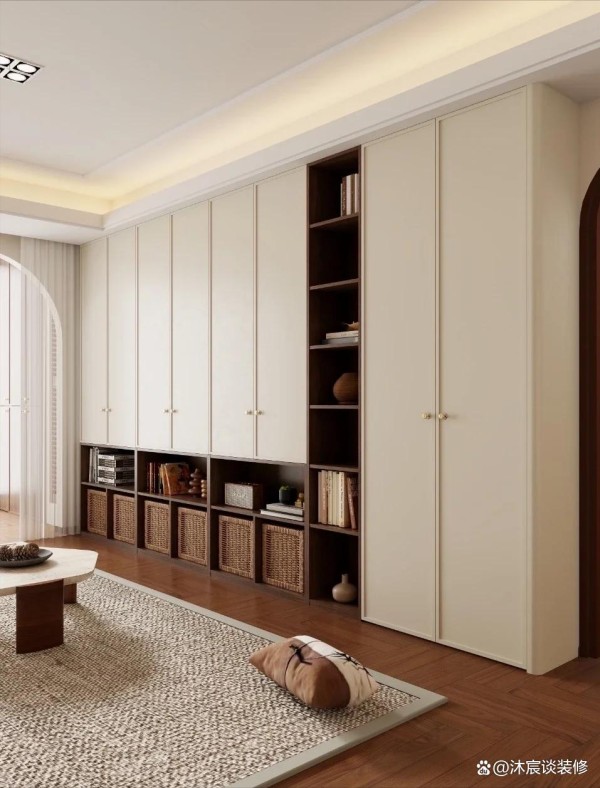 把柜子底部两层都做成开放格,最底下用来放活动收纳箱,可以收纳孩子的玩具,不同的收纳箱分类存放,孩子们玩完后自己就能收拾好再自己推回去——养成主动收拾好习惯;上面一层的开放格用来收纳绘本。之所以将底下两层设计给孩子使用,是因为与他们的身高匹配,这样他们自己就能主动拿取和收拾,我们做父母的也就更加轻松了。